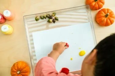 Place a bunch of acorns inside the bin and let your little one shake it around to “paint” with the acorns!
