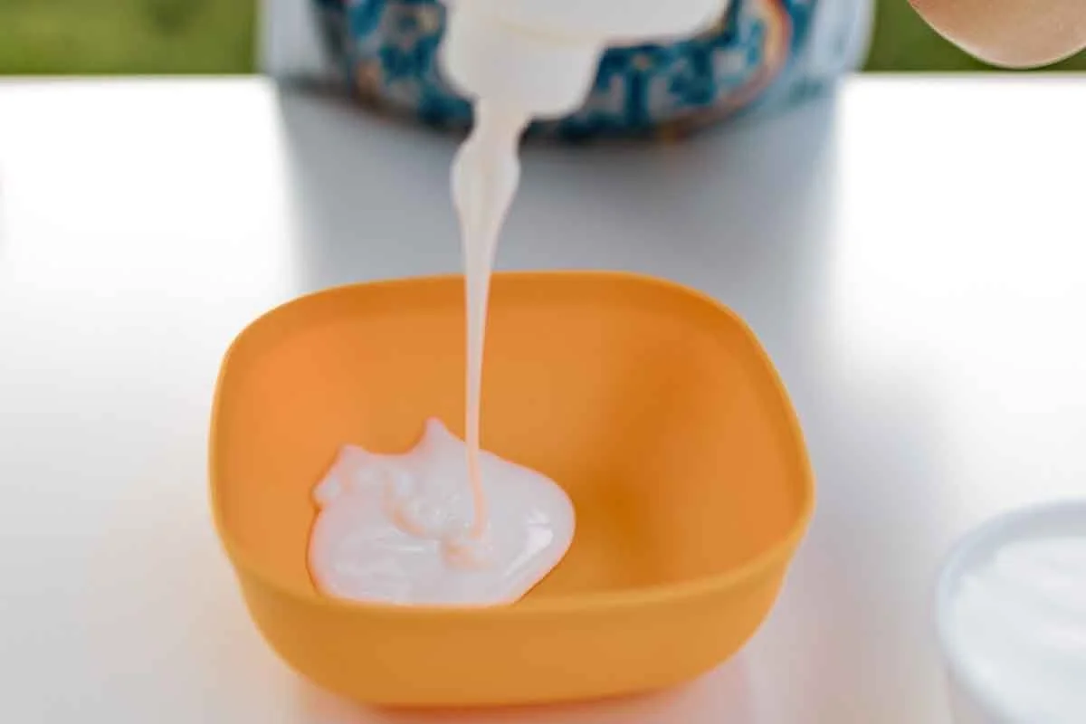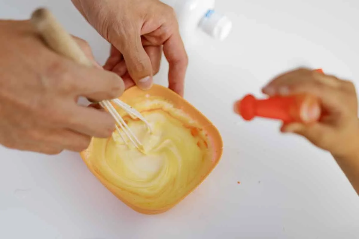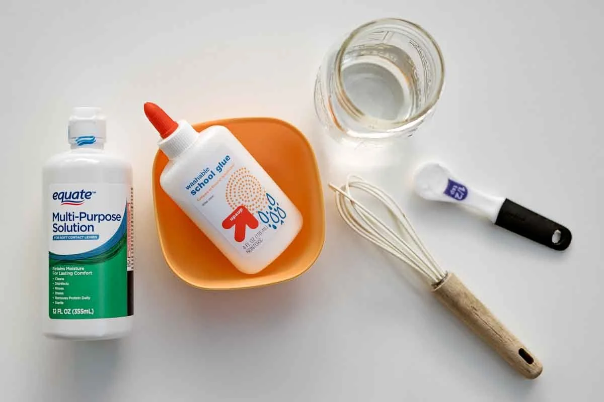 Add 4 oz of glue, ½ tsp baking soda, ½ cup of water, 2 tbsp lens solutions to your mixing container and whisk together (add more lens solution until you get a nice slime consistency)